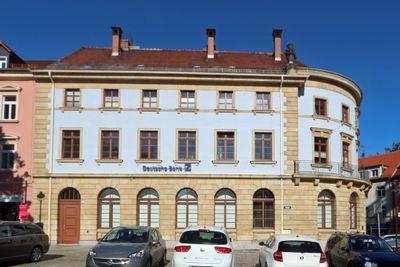 Schulplatz 3, Stattlicher repräsentativer Bau mit abgerundeter Ecke, baugeschichtlicher Wert und städtebauliche Bedeutung, Erdgeschoss mit Putznutung, Zahnschnittfries, aufwändige Rahmung von Fenster- und Türöffnungen, Flammenvasenaufsatz