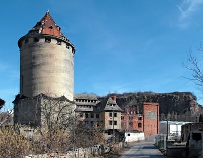 Weizenmühle Coschütz, Mühlengebäude mit rundem Siloturm; erbaut von der Firma Gebrüder Braune, vor allem der Turm weithin sichtbar, ortsgeschichtlich und städtebaulich bedeutend