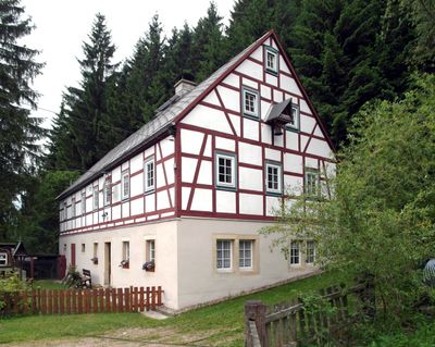 Müllermühle, Seitengebäude: Seitengiebel Fachwerk, mit Uhr, sonst Fachwerk verbrettert, Giebel böhmisch verbrettert, Satteldach mit Schieferdeckung, ehemals hier Schneidemühle und Kistenfabrik, Mühlgraben verbrochen, im Profil noch erkennbar