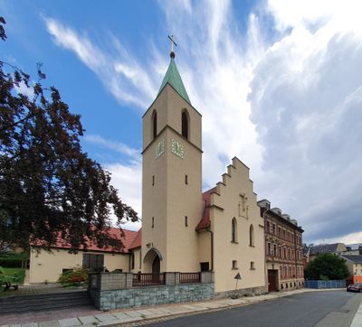 St. Marien, Im Stil zwischen Neuer Sachlichkeit und Neogotik, baugeschichtlich und künstlerisch von Bedeutung. Grundsteinlegung: 24. April 1927, Weihe: 13. August 1927, zeitgleiche Ausstattung: farbige Fenster, Bänke, bildkünstlerische Werke, Farbglasfenster