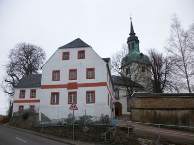 Sachgesamtheit Dorfkirche, Kirchschule und Pfarrhof Wiederau mit folgenden Einzeldenkmalen: Pfarrhaus, Seitengebäude und Einfriedungsmauern , Kirche, Kirchhofseinfriedung mit Tor im Norden sowie, school in Königshain-Wiederau, Germany