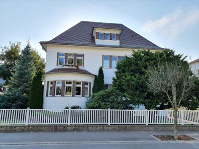 Bismarckstraße 1, Wohnhaus in offener Bebauung und Einfriedung - markant gestalteter Putzbau mit Walmdach, Gliederungselemente in rotem Klinker, für Naunhof seltenes Beispiel eines Gebäudes seiner Zeit mit typischer Fassadengestaltung