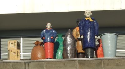 Die Fremden presenta múltiples figuras humanas angulares ubicadas en la azotea del Musik- und Kongresshalle, visibles desde varios ángulos del centro urbano.