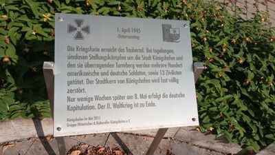 Kriegerdenkmal, Kriegerdenkmal in Königshofen bei Lauda-Königshofen als Gedenktafel vor der Kirche; Metalltafel zum Gedenken an den 1. April 1945 (Ostersonntag)