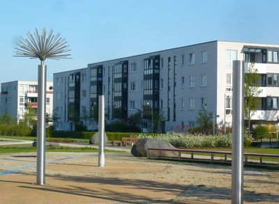 Springbrunnen und Plansche, water spray field and a fountain installation at Altlandsberger Platz in Berlin-Marzahn, Germany