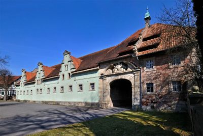 El Rittergut Völkershausen presenta una mansión de dos pisos con entramado de madera y edificios auxiliares construidos en arenisca rosa junto al río Werra.