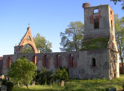 La ruina de la iglesia de Flieth muestra muros de piedra expuestos y elementos arquitectónicos típicos de las iglesias rurales de Brandeburgo. La estructura restante refleja cómo se construían los edificios religiosos en esta región hace siglos.