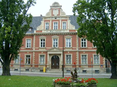 El edificio de correos, junto con la casa residencial adyacente del período Gründerzeit, define el carácter de la plaza Neustädter.