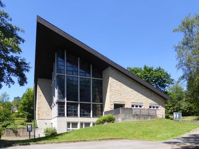 La iglesia presenta una torre campanario independiente de hormigón visto y paredes recubiertas con arenisca de Obernkirchen junto a la carretera federal 497.