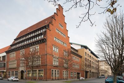 La Casa Ernst-Grote es un edificio de oficinas con un prominente portal de entrada arqueado rematado con un escudo familiar, flanqueado por figuras de comerciantes a tamaño natural. La fachada fusiona la función moderna con detalles artesanales que reflejan el negocio familiar.