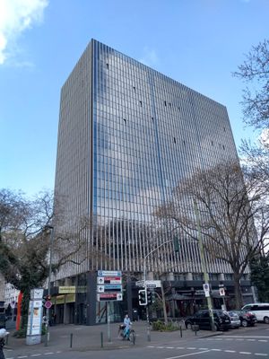 La Torre Immermann se eleva 55 metros sobre Immermannstraße 40, con una fachada modernista que incorpora elementos de acero y vidrio.