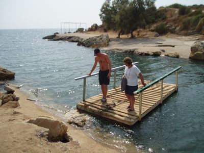 Una plataforma flotante permite cruzar el río que divide la playa, conduciendo a una cala adicional llamada Vrahinari.