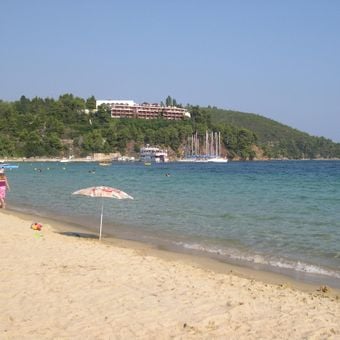 Koukounaries es una playa y asentamiento costero en Skiathos con arena dorada y aguas cristalinas rodeadas de bosques de pinos densos. La línea de costa se extiende varios cientos de metros con agua tibia y poco profunda, con zonas de alquiler de equipos y actividades acuáticas.