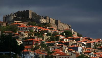 La fortaleza de piedra se eleva 90 metros sobre el nivel del mar en una colina, con murallas defensivas que rodean la cumbre de Mithymna.