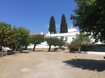 El monasterio alberga varios animales incluyendo avestruces, mientras ovejas y cabras deambulan libremente bajo robles de amplias copas dentro de sus murallas.