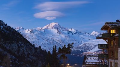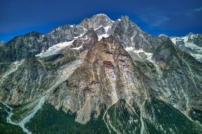 El pico granítico de 4,805 metros marca la frontera entre Francia e Italia, con nieve perpetua y múltiples glaciares en sus laderas.
