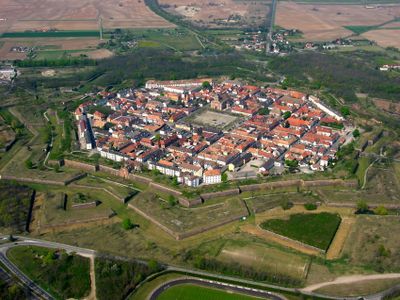 La ciudad presenta un diseño octagonal con una geometría perfecta, que incorpora 48 cuarteles dispuestos alrededor de una plaza central y murallas defensivas.