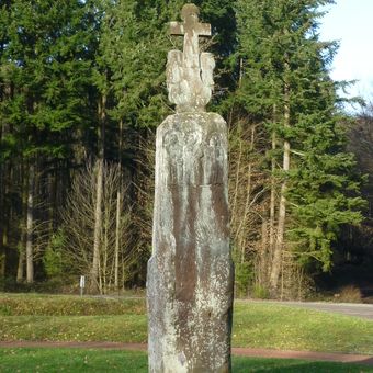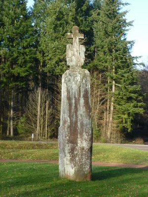 El Breitenstein, construido en arenisca roja, se eleva 4.4 metros en el bosque con relieves tallados de doce apóstoles en sus cuatro lados.