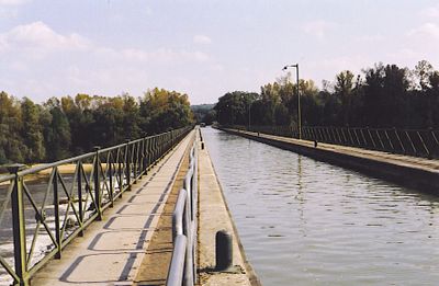 El acueducto de Briare transporta más de 13.000 toneladas de agua sobre catorce pilares, midiendo 662 metros de longitud y 11,5 metros de ancho.