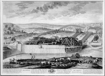La Máquina de Marly contenía catorce ruedas hidráulicas de doce metros de diámetro que impulsaban 221 bombas para transportar agua del río Sena.