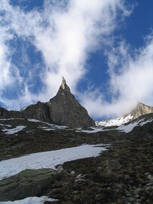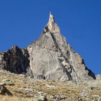 La Aiguille Dibona alcanza los 3.131 metros de altura, formando una aguja característica en el Parque Nacional des Écrins.