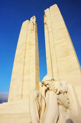El monumento de piedra caliza y hormigón presenta dos pilones de 27 metros sobre una plataforma con esculturas que representan a Canadá y Francia.