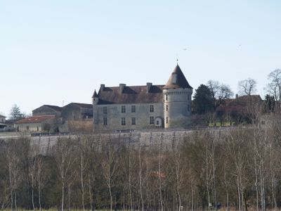 El castillo rectangular se extiende paralelo al río Charente, con una gran torre redonda almenada coronada por un tejado cónico de tejas planas.