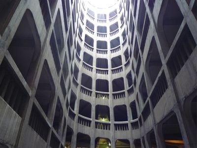 La estructura del aparcamiento presenta una rampa helicoidal continua con una pendiente del 5% que completa siete revoluciones completas.