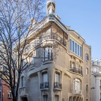 Hôtel Guimard es una residencia de tres pisos en la avenida Mozart 122 con ventanas asimétricas, muros de piedra y patrones decorativos de ladrillo en su estructura triangular. La fachada exhibe elementos característicos del Art Nouveau con formas orgánicas y detalles de superficie refinados.