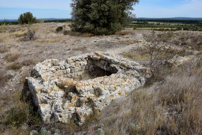 Los restos de Montlaurès se elevan sobre una colina al norte de Narbona, mostrando muros de piedra y elementos estructurales de antiguas fortificaciones.