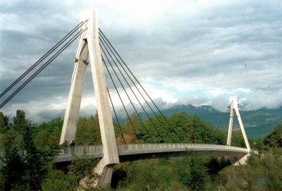 La Passerelle de Meylan se extiende por 125.7 metros, presentando una sección de cubierta triangular y pilones en forma de Y invertida.