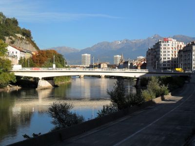 El Pont de la Porte de France se extiende 109.1 metros sobre el río Isère, conectando las orillas derecha e izquierda en el centro de Grenoble.
