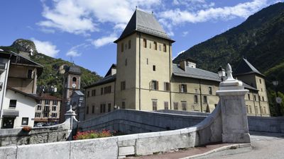 El Vieux-Pont se extiende sobre el río Isère con múltiples pilares de piedra que sostienen su estructura, conectando ambos lados de Moûtiers.