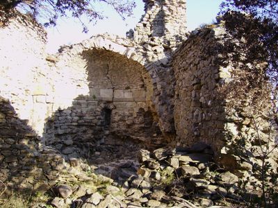 La iglesia se encuentra sobre escarpados salientes con vistas al río Têt, con restos de su entrada visibles a través del muro sur derrumbado.