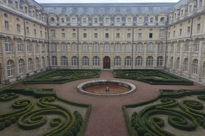El Claustro de Val-de-Grâce exhibe arquitectura clásica con elaborados trabajos en piedra y elementos de diseño simétrico en toda su estructura.