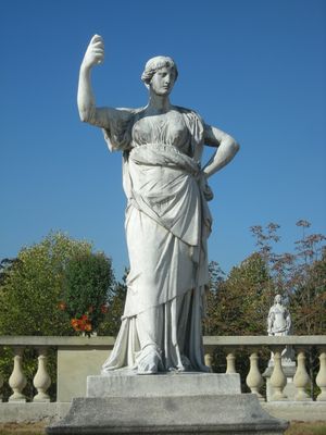 La estatua presenta técnicas escultóricas romanas clásicas, ubicada en una zona conocida como d'Apres l'Antique dentro de los jardines.