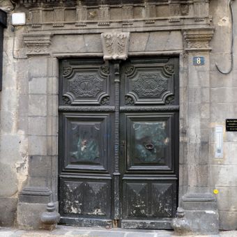 Este edificio del siglo XVIII presenta una puerta de roble moldurado con dos hojas simétricas, enmarcada por pilastras dóricas que sostienen un entablamento decorado con triglifos y detalles esculturales.