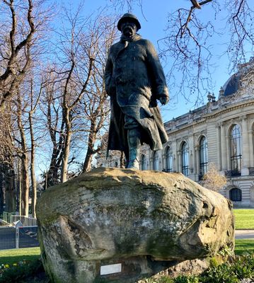 La estatua de bronce de gran tamaño representa a Georges Clemenceau de pie en posición dominante cerca del cruce entre Petit Palais y jardines Champs-Élysées.