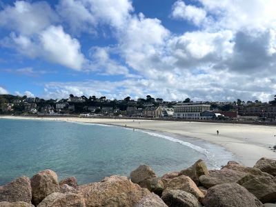 Trestraou es una playa amplia de arena fina en la costa norte de Bretaña con buenas condiciones para nadar. Frente a la orilla se ven pequeñas islas, mientras que detrás de la arena hay áreas verdes y caminos para pasear.