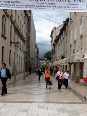 La calle Marmontova se extiende desde el paseo marítimo Riva hasta el Teatro Nacional Croata y presenta edificios de piedra caliza con fachadas decorativas y amplios pasos peatonales. La calle está completamente reservada para peatones y alberga numerosas tiendas, cafes y un mercado de pescado diario.