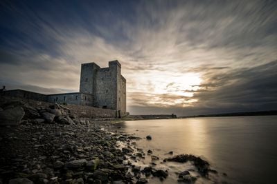 El Castillo de Oranmore se alza como una torre rectangular de piedra con cuatro niveles y una torreta cuadrada de escaleras frente a la Bahía de Galway.