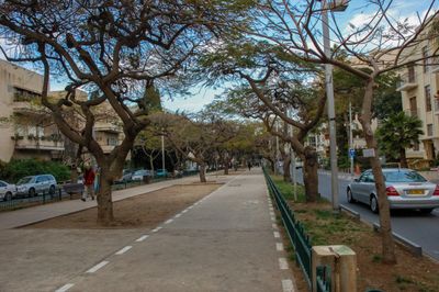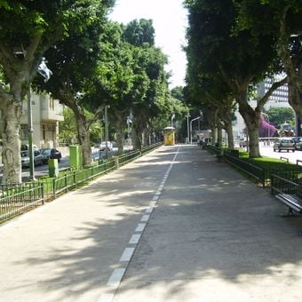 El bulevar se extiende desde Neve Tzedek hasta el Teatro Habima, con una franja peatonal central y carriles para bicicletas bajo árboles ficus.