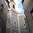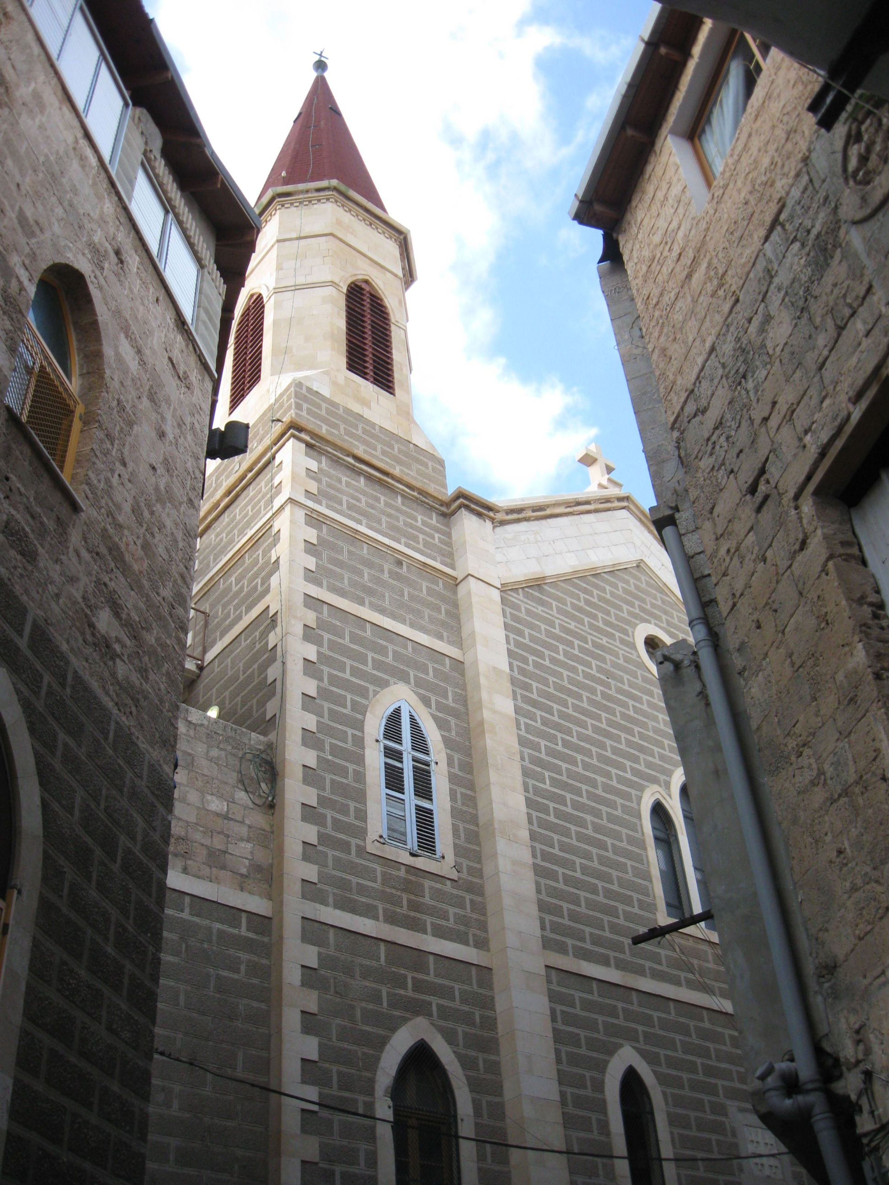 La Iglesia Terra Sancta exhibe una torre gótica con una aguja roja que se eleva sobre las estructuras circundantes en el centro de la Ciudad Vieja de Acre.