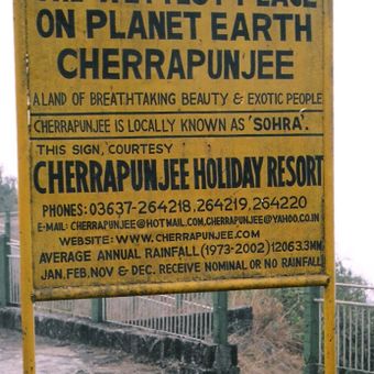 Cherrapunji es una capital tradicional en el distrito de East Khasi Hills en India, situada en una meseta con pendientes pronunciadas que descienden hacia valles boscosos. La zona presenta numerosas cascadas que caen por paredes rocosas mientras una densa vegetación cubre las laderas y senderos estrechos serpentean a través de la vegetación.