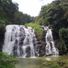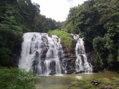 Varios manantiales de montaña confluyen en este punto antes de unirse al río Kaveri, formando una amplia cortina de agua sobre rocas oscuras.