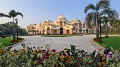 La Casa Hyderabad presenta 36 habitaciones con alas simétricas y cúpulas, incorporando elementos europeos clásicos con detalles arquitectónicos indios.