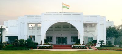 El Raj Niwas presenta elementos arquitectónicos tradicionales indios y coloniales británicos, con jardines que rodean el complejo administrativo principal.