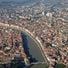 La ciudad de Pisa se extiende por ambas orillas del río Arno, con murallas medievales que rodean su centro histórico cerca del mar de Liguria.