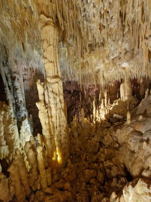 La cámara conocida como Grotta Bianca contiene formaciones de alabastro blanco puro que reflejan la luz en diferentes patrones sobre sus superficies cristalinas.