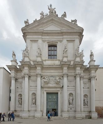 La iglesia exhibe una fachada de dos niveles con ocho columnas, decorada con estatuas bíblicas creadas por varios escultores venecianos, incluyendo Giuseppe Torretti.